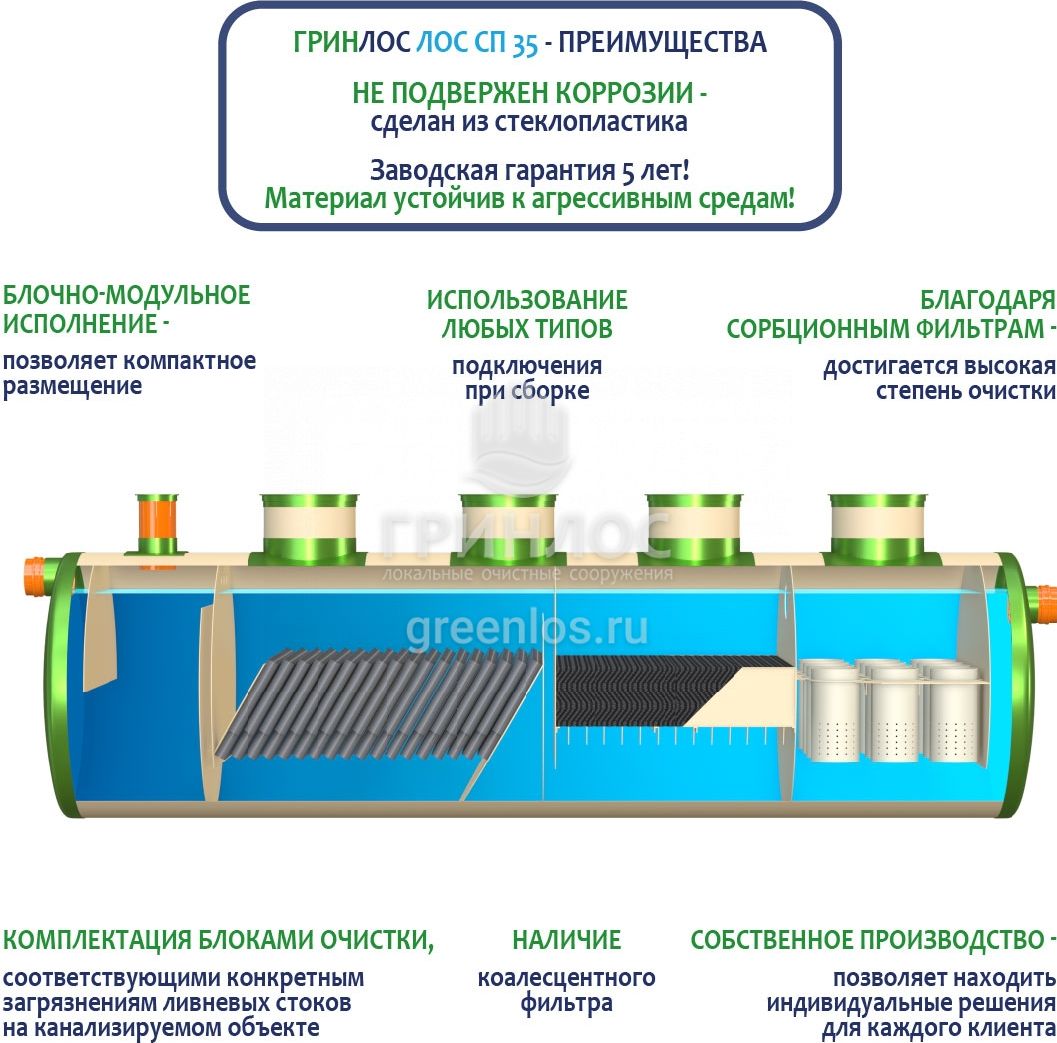 Ливневая канализация Гринлос ЛК 35-2300 Сп снабжена отсеком, в котором стоки проходят окончательную очистку через фильтр-патрон с сорбентом.