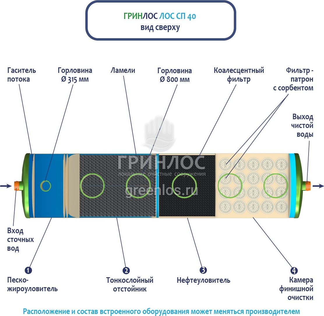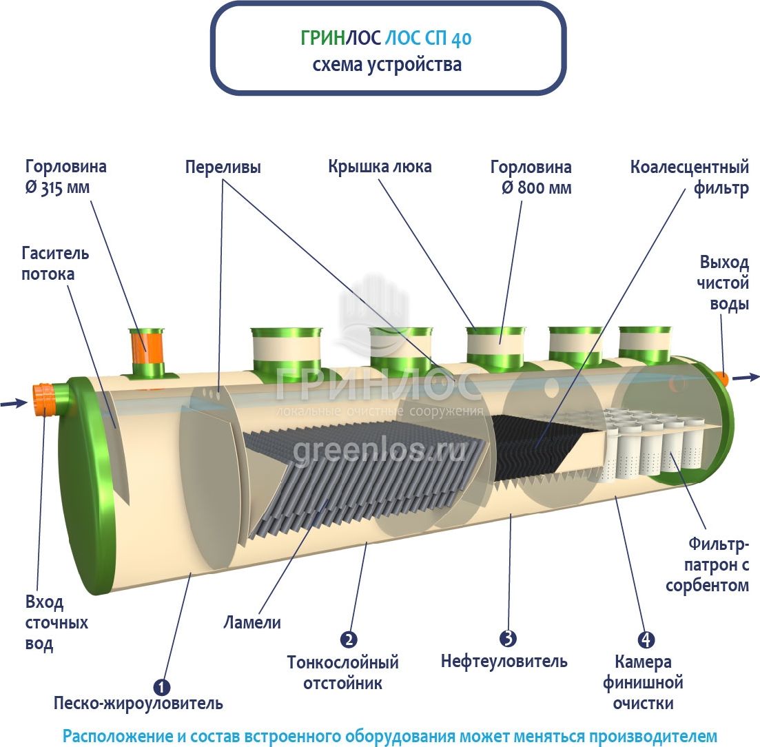 В базовую комплектацию Ливневой канализации Гринлос входит нефтеловушка, которая работает по принципу отстаивания стоков