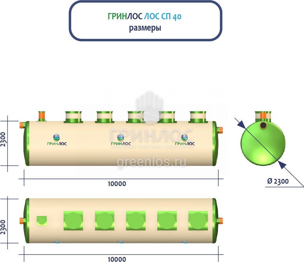 ГРИНЛОС Ливневая канализация 40-2300 стеклопластиковая представляет собой очистное сооружение ливневых стоков габаритами 10000*2300*2300 мм - 1 корпус. Общий объем корпусов составляет 41.5 м3. Для установки станции потребуется применение вспомогательного оборудования.