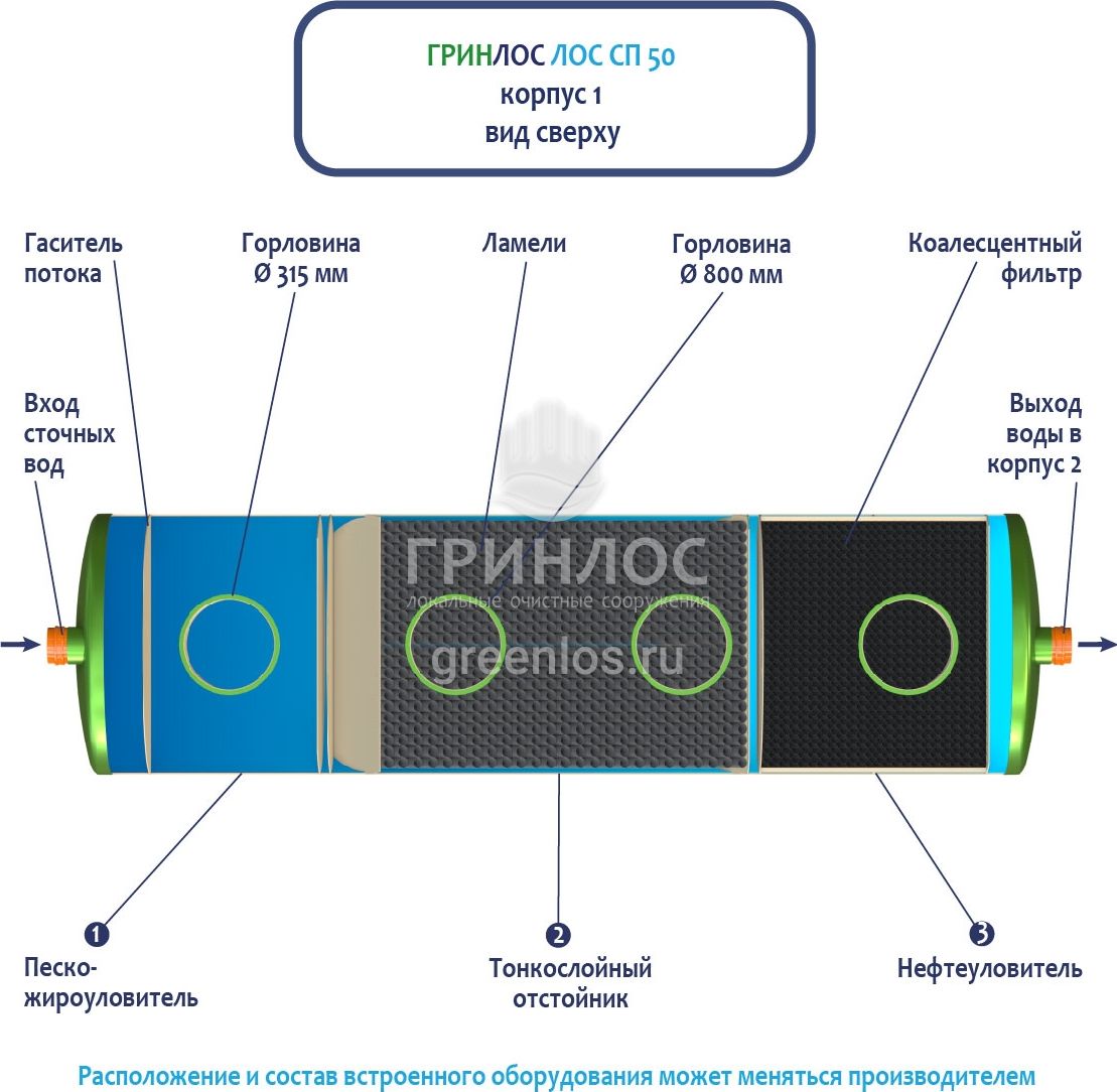 Стоки через входной патрубок корпуса Гринлос ГРИНЛОС Ливневая канализация 50-2300 стеклопластиковая попадают в песко-жироуловитель, где под воздействием седиментации из стоков выделяются взвеси и маслянистые вещества, за счет разницы плотностей твердые частицы оседают на дно, жиры собираются на поверхности.