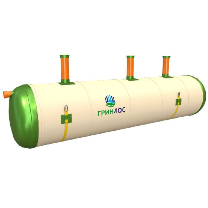 Конструкция Накопительный Гринлос СП 10 представляет собой цилиндр, выполненный из стеклопластика. Внутри цилиндр с помощью перегородок разделен на камеры, сообщающиеся между собой через отверстия для перелива.