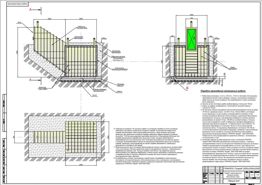 При проектировании и монтаже Гринлос Погреб ДТ 2000*2000*2000 необходимо руководствоваться рекомендациями Технического Паспорта, проектной документацией, рекомендациями проектировщиков, а также действующими нормами и правилами: СП 45.13330.2012 Земляные сооружения, основания и фундаменты; СП 70.13330.2012 Несущие и ограждающие конструкции; СП 12-135-2003 Безопасность труда в строительстве; СП 22.13330.2011 Основания зданий и сооружений; актуальное издание ПУЭ (правила устройства электроустановок). Лица, выполняющие монтаж, должны иметь опыт и необходимую квалификацию, подтвержденную документально, для проведения строительных работ, а также для использования необходимой для проведения работ техники, инструментов и механизмов.