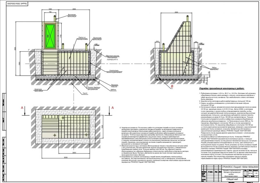 При условии уровня грунтовых вод выше 1500 мм от уровня земли, при наличии плывуна, при монтаже в скальных грунтах и прочих нестандартных ситуациях, а также при монтаже Гринлос Погреб ДТБ 1500*1500*2000 под зданиями, сооружениями, любыми постройками и при организации пешеходной или проезжей зоны над Гринлос Погреб ДТБ 1500*1500*2000, в случае заглубления Гринлос Погреб ДТБ 1500*1500*2000 более чем на 250 мм от верхнего пластикового горизонтального перекрытия до запланированного после проведения финишного благоустройства уровня земли песчано-цементную смесь не-обходимо заменить бетоном, а непосредственно над верхним пластиковым горизонтальным перекрытием Гринлос Погреб ДТБ 1500*1500*2000 необходимо смонтировать разгрузочную плиту, опирающуюся на бетонные стенки, возведенные по периметру устанавливаемого Гринлос Погреб ДТБ 1500*1500*2000, опирающиеся на выпуск плиты основания. Расчет толщины и конструкции стен и разгрузочной плиты производит специализированная проектная организация исходя из предполагаемой нагрузки.