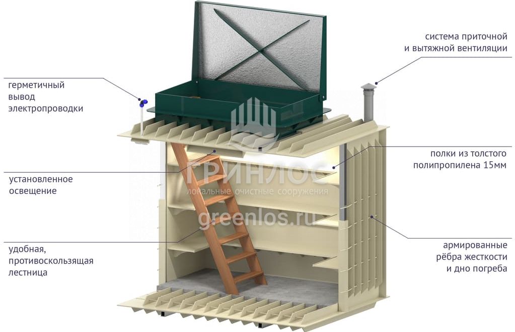 Для функциональной эксплуатации Гринлос Погреб Погреб ЛК 2500*2000*2000 оборудован приточной и вытяжной вентиляцией, освещением, полками, лестницей, крышкой.