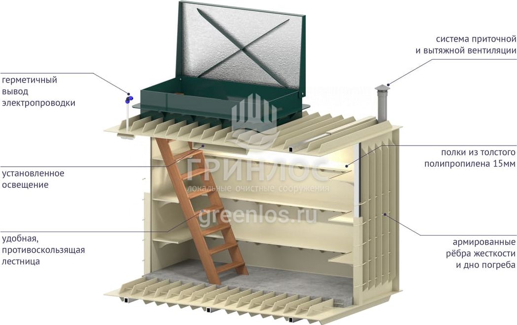 Для функциональной эксплуатации Гринлос Погреб Погреб ЛК 3000*2000*2000 оборудован приточной и вытяжной вентиляцией, освещением, полками, лестницей, крышкой.