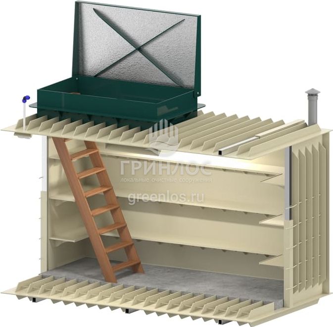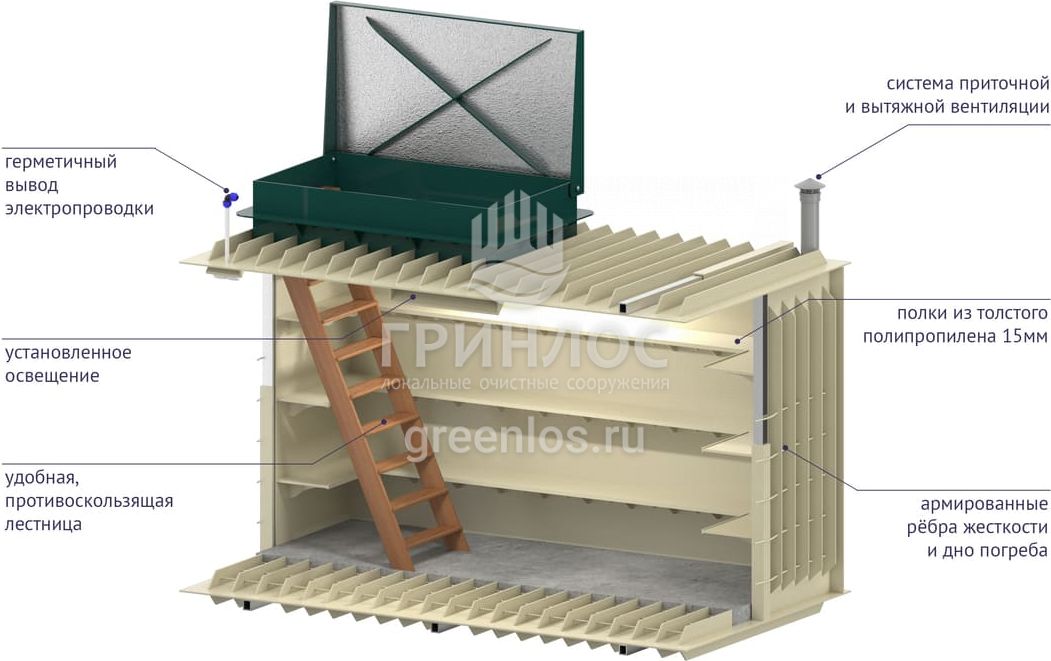 Для функциональной эксплуатации Гринлос Погреб Погреб ЛК 3500*1500*2000 оборудован приточной и вытяжной вентиляцией, освещением, полками, лестницей, крышкой.