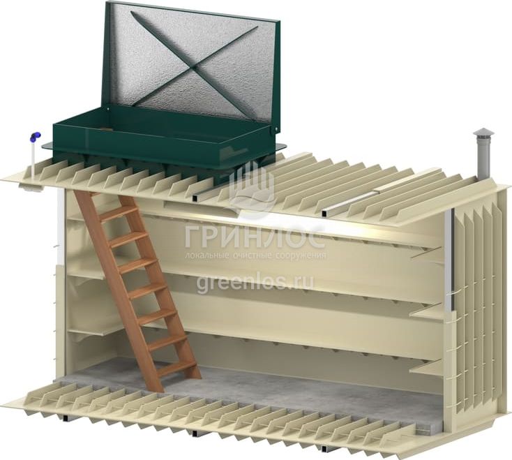 Для функциональной эксплуатации Гринлос Погреб Погреб ЛК 4000*1500*2000 оборудован приточной и вытяжной вентиляцией, освещением, полками, лестницей, крышкой.