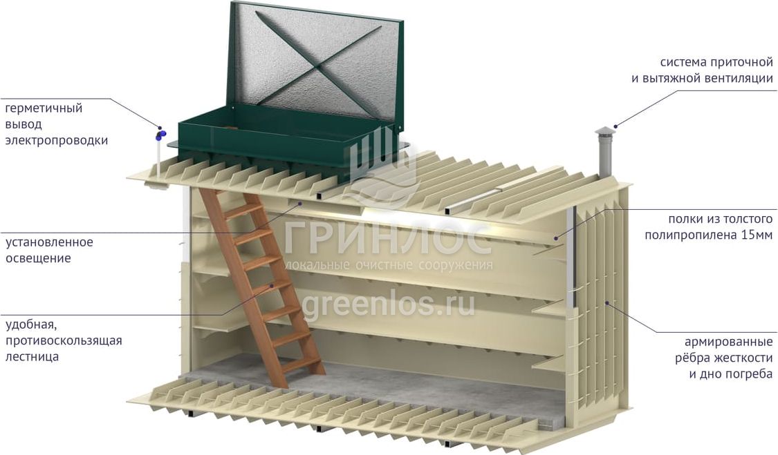 «ГРИНЛОС Погреб» представляет собой заглубленное герметичное техническое помещение габаритами 4х2х2 м. Устройство поставляется в полной заводской готовности для круглогодичного хранения продуктов питания – овощей, солений и др. домашних запасов.