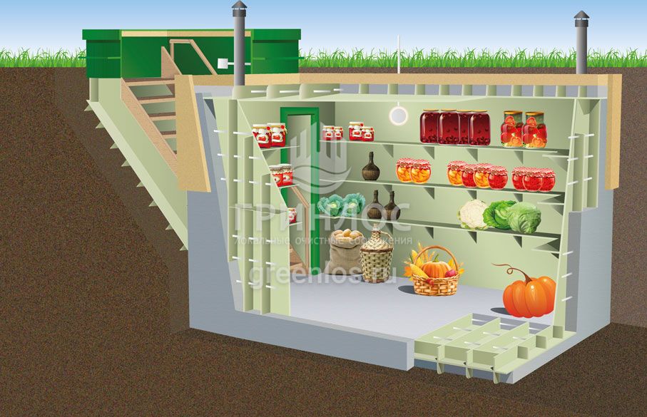 «ГРИНЛОС Погреб» представляет собой заглубленное герметичное техническое помещение габаритами 4х1.5х2 м. Устройство поставляется в полной заводской готовности для круглогодичного хранения продуктов питания – овощей, солений и др. домашних запасов.