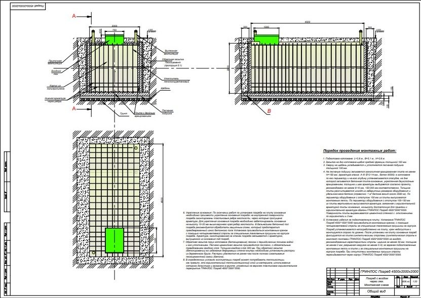 При условии уровня грунтовых вод выше 1500 мм от уровня земли, при наличии плывуна, при монтаже в скальных грунтах и прочих нестандартных ситуациях, а также при монтаже Гринлос Погреб ЛС 4500*2000*2000 под зданиями, сооружениями, любыми постройками и при организации пешеходной или проезжей зоны над Гринлос Погреб ЛС 4500*2000*2000, в случае заглубления Гринлос Погреб ЛС 4500*2000*2000 более чем на 250 мм от верхнего пластикового горизонтального перекрытия до запланированного после проведения финишного благоустройства уровня земли песчано-цементную смесь не-обходимо заменить бетоном, а непосредственно над верхним пластиковым горизонтальным перекрытием Гринлос Погреб ЛС 4500*2000*2000 необходимо смонтировать разгрузочную плиту, опирающуюся на бетонные стенки, возведенные по периметру устанавливаемого Гринлос Погреб ЛС 4500*2000*2000, опирающиеся на выпуск плиты основания. Расчет толщины и конструкции стен и разгрузочной плиты производит специализированная проектная организация исходя из предполагаемой нагрузки.