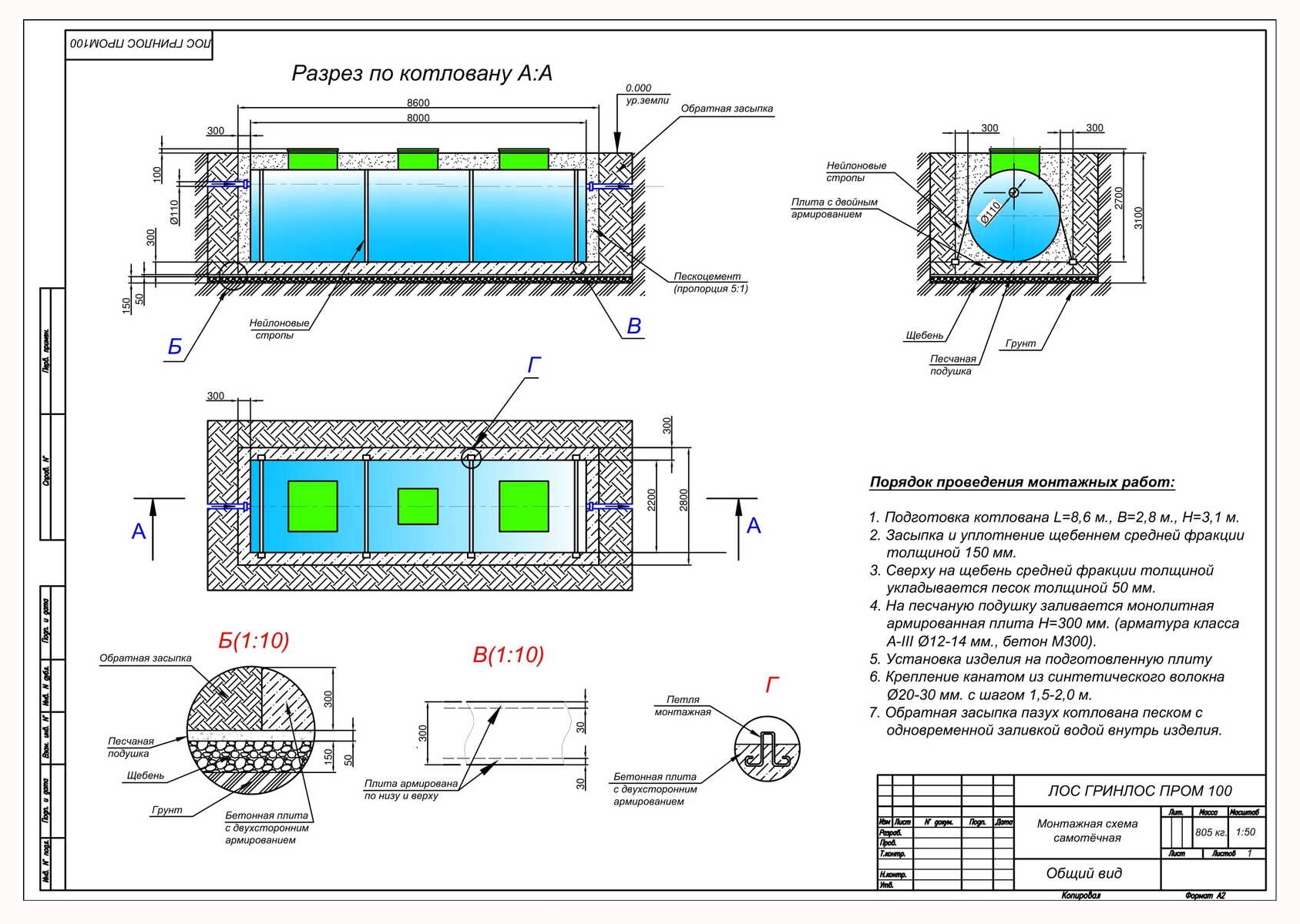 - Установка ГРИНЛОС Пром 100 Пр. Перед началом работ выполняется входной контроль качества, осмотр оборудования с целью обнаружения дефектов, полученных при транспортировке и хранении, с последующим подписанием акта передачи оборудования в монтаж. Так как станция имеет вес 805 кг, установка производится монтажным краном, с помощью четырехветвевой стропы. Септик монтируется строго по уровню. После установки он фиксируется на плите синтетическими стропами за заранее подготовленные монтажные петли в плите.