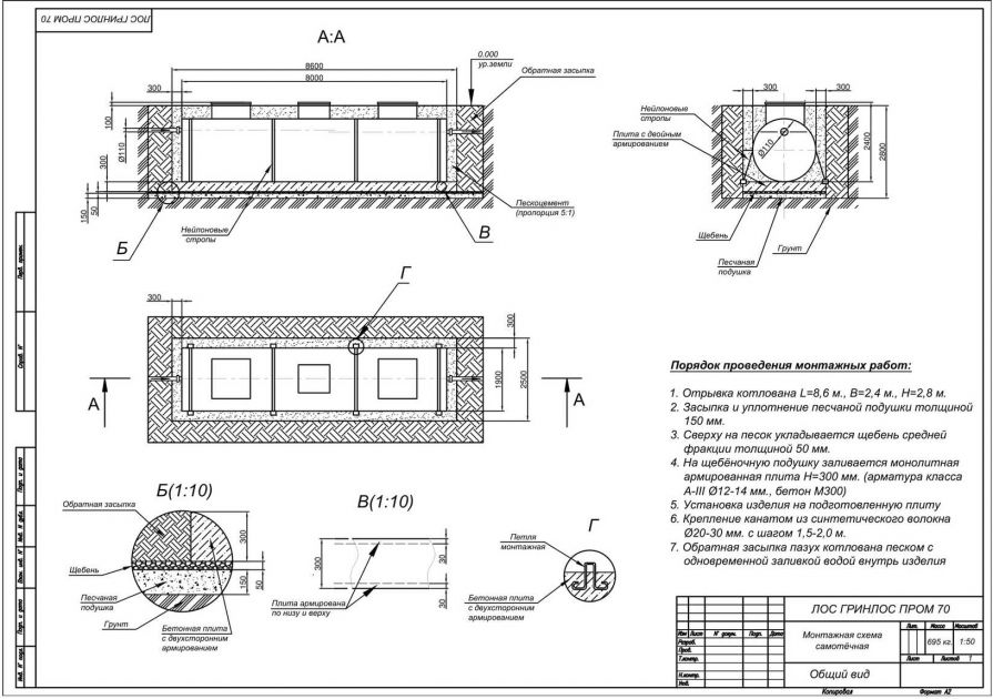 - Установка ГРИНЛОС Пром 70. Перед началом работ выполняется входной контроль качества, осмотр оборудования с целью обнаружения дефектов, полученных при транспортировке и хранении, с последующим подписанием акта передачи оборудования в монтаж. Так как станция имеет вес 695 кг, установка производится монтажным краном, с помощью четырехветвевой стропы. Септик монтируется строго по уровню. После установки он фиксируется на плите синтетическими стропами за заранее подготовленные монтажные петли в плите.