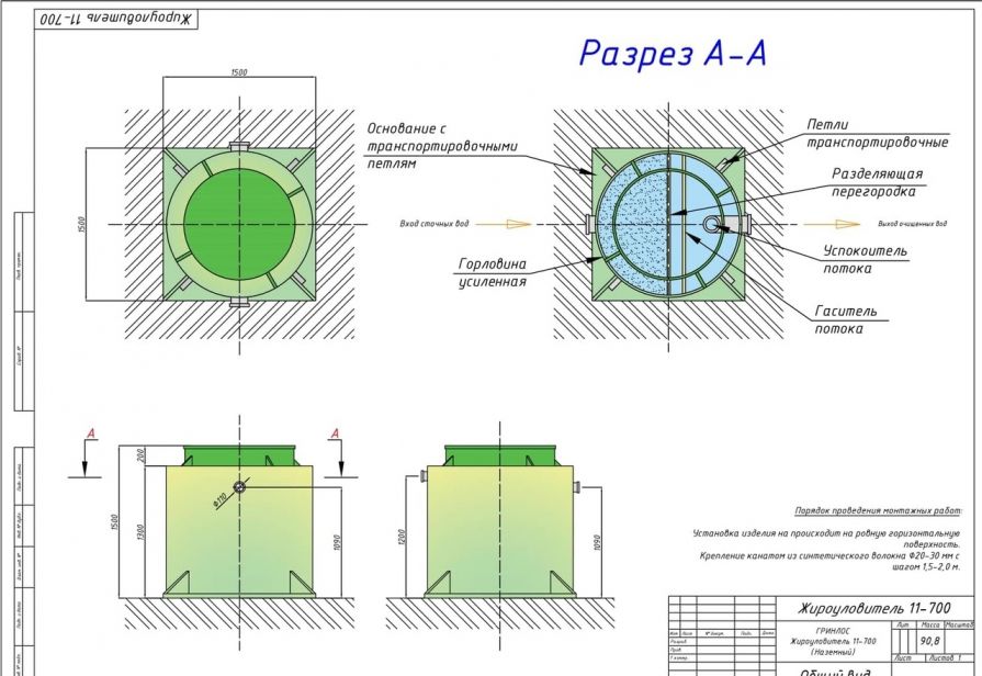 Гринлос Жироуловитель 11-700 Вертикальный Наземный ставят в технические, подвальные помещения. Требуется, чтобы к ним был организован удобный подход, подъезд, чтобы проводить эксплуатацию, подключение к производственной канализации.