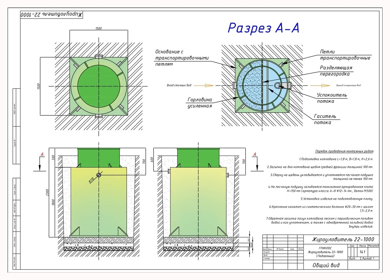 По окончании работ по устройству котлована и траншей выполняется инструментальная проверка соответствия проекту траншей для подводящего/отводящего трубопровода и котлована с составлением акта скрытых работ с приложением фотоотчета монтажа ГРИНЛОС Жироуловитель 22-1000 Вертикальный.