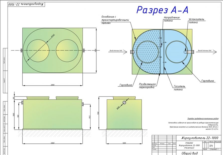Данная модель жироуловителя предполагает наземную установку, например, в техническое или подвальное помещение, и обладает 2 стандартными горловинами, высотой 100 мм и диаметром 0,74 м. Горизонтальное расположение корпуса облегчает доступ к внутренним узлам.