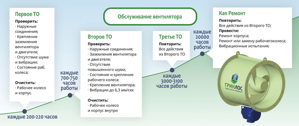 Для стабильной и эффективной работы промышленного осевого вентилятора, а также для продления срока его службы, необходимо регулярно проводить техническое обслуживание и профилактические мероприятия: