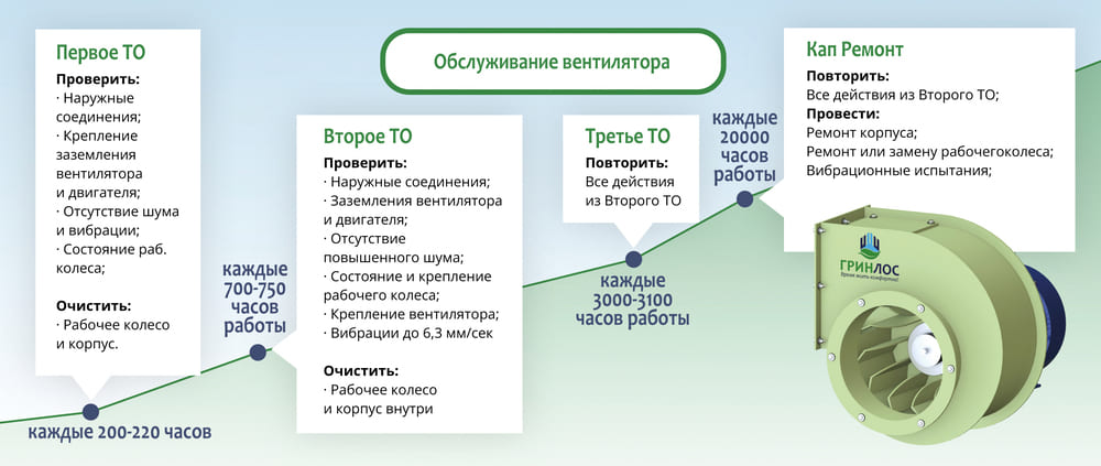 Основные мероприятия по обслуживанию радиального вентилятора низкого давления марки ГРИНЛОС разбиваются на несколько этапов.